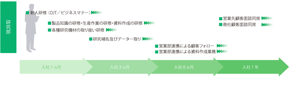 最低限の化学知識(原料、製品)を学んで頂き、長期に渡る経験を経て、研究を託す人を育成します。