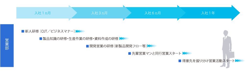 また先輩営業マンと同行して新製品の開発営業を学んで頂き、担当先を任され独り立ちして頂きます。
